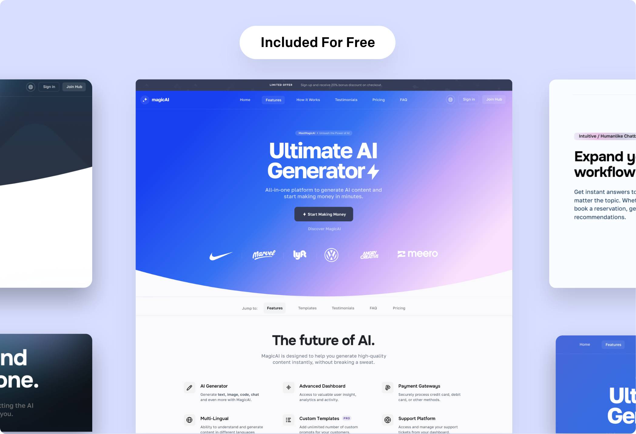 Take a closer look at both the landing page and dashboard of your next AI SaaS platform. These essential features are designed to enhance your experience and are included at no extra cost with your purchase.