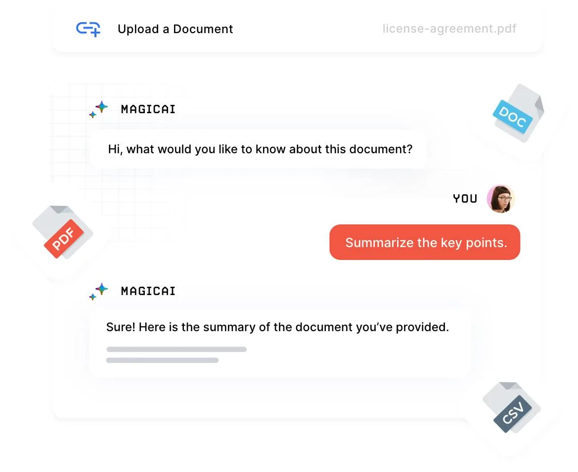 Need to extract specific information from a PDF, .doc or CSV document? MagicAI now swiftly navigates through the document, providing you with instant insights, summaries, or key data points.